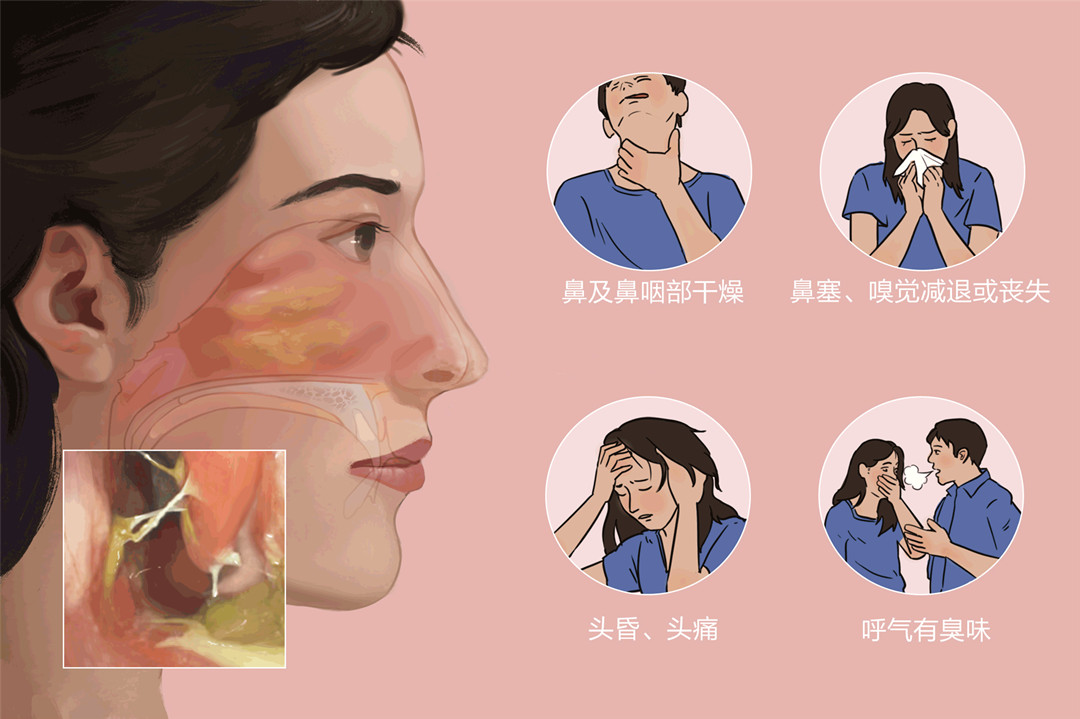 2.鼻咽干燥:鼻黏膜萎縮后,腺體分泌顯著減少,這就導致了鼻咽部干燥的癥狀。此時,鼻分泌物變得少而黏稠,難以擤出。在病情嚴重時,分泌物會干結成黃綠色的筒狀或片狀痂皮,進一步加重患者的不適。
