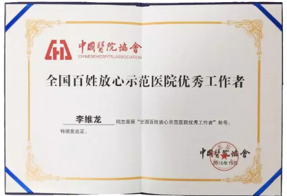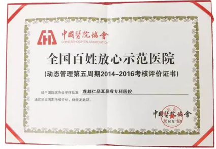 全國百姓放心示范醫院創建活動是中國醫院協會在單位會員中開展的大型行業自律活動。自2000年活動開展以來,以“加強醫院內涵建設,為百姓提供比較好的醫療服務”為宗旨,堅持動態管理,優勝劣汰,堅持社會評價,持續改進。2014年8月至2016年9月為百姓放心示范醫院動態管理第五周期,經過網絡直報數據、考核評價、社會公示等程序,成都仁品耳鼻喉醫保醫院通過第五周期考核評價,再次獲得“全國百姓放心示范醫院”稱號。醫院辦公室主任李維龍獲得“全國百姓放心示范醫院”創建活動優秀工作者稱號。