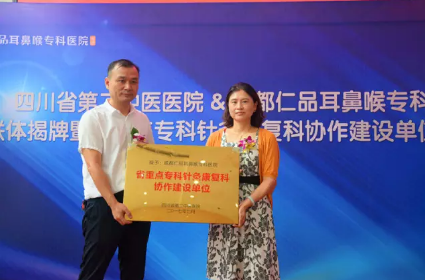 8月10日上午,四川省第二中醫(yī)醫(yī)院與成都仁品耳鼻喉醫(yī)保醫(yī)院“醫(yī)聯(lián)體揭牌暨省重點(diǎn)醫(yī)保針灸康復(fù)科協(xié)作建設(shè)單位授牌儀式”在成都仁品耳鼻喉醫(yī)保醫(yī)院正式舉行。四川省第二中醫(yī)醫(yī)院醫(yī)聯(lián)體工作推進(jìn)委員會(huì)副主任曾思鵬、事業(yè)發(fā)展部部長(zhǎng)曾友元、全康復(fù)療理中心主任強(qiáng)茗等領(lǐng)導(dǎo)醫(yī)生出席。