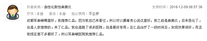 患者對成都仁品耳鼻喉醫保醫院哪里好給出的評價