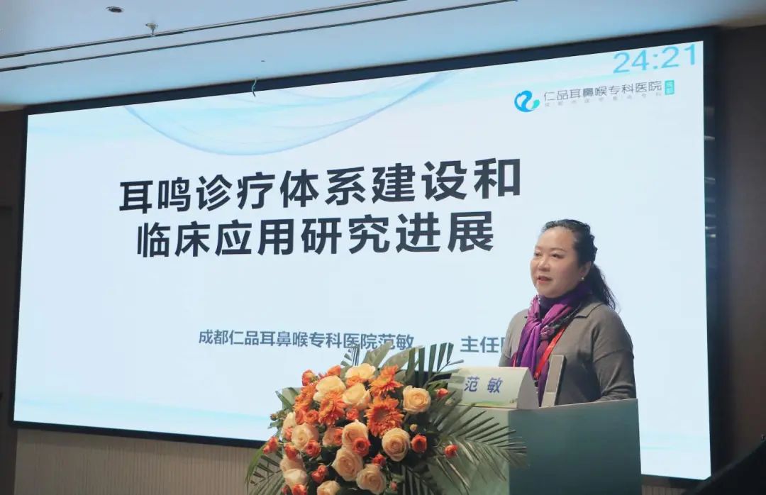 成都仁品常務副院長范敏院長受邀擔任授課嘉賓,深入闡述了《耳鳴診療體系建設和臨床應用研究進展》,耳鳴是困擾人們健康的常見病,可能會伴有焦慮、抑郁、睡眠障礙等不良癥狀,嚴重影響患者的生活質量與工作效率。范敏教授從耳鳴的診斷、檢查、評估、個性化診療方案等方面分享《耳鳴綜合療法2.0》的優勢及診療效果。近年來,我院大力引進人才隊伍、搭建耳鳴耳聾專病門診、打造耳鳴-聽覺過敏特色疾病數據庫、不斷搭建研究平臺,形成多中心、大樣本的耳鳴研究中心。