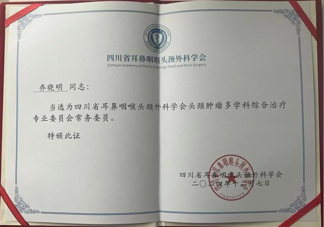 值得一提的是,會上,喬曉明主任當選四川省耳鼻咽喉頭頸外科學會頭頸腫瘤多學科綜合治療專業委員會常務委員。該榮譽的獲得,代表著喬曉明主任及成都仁品在耳鼻咽喉頭頸外科的影響力邁上了新的臺階。