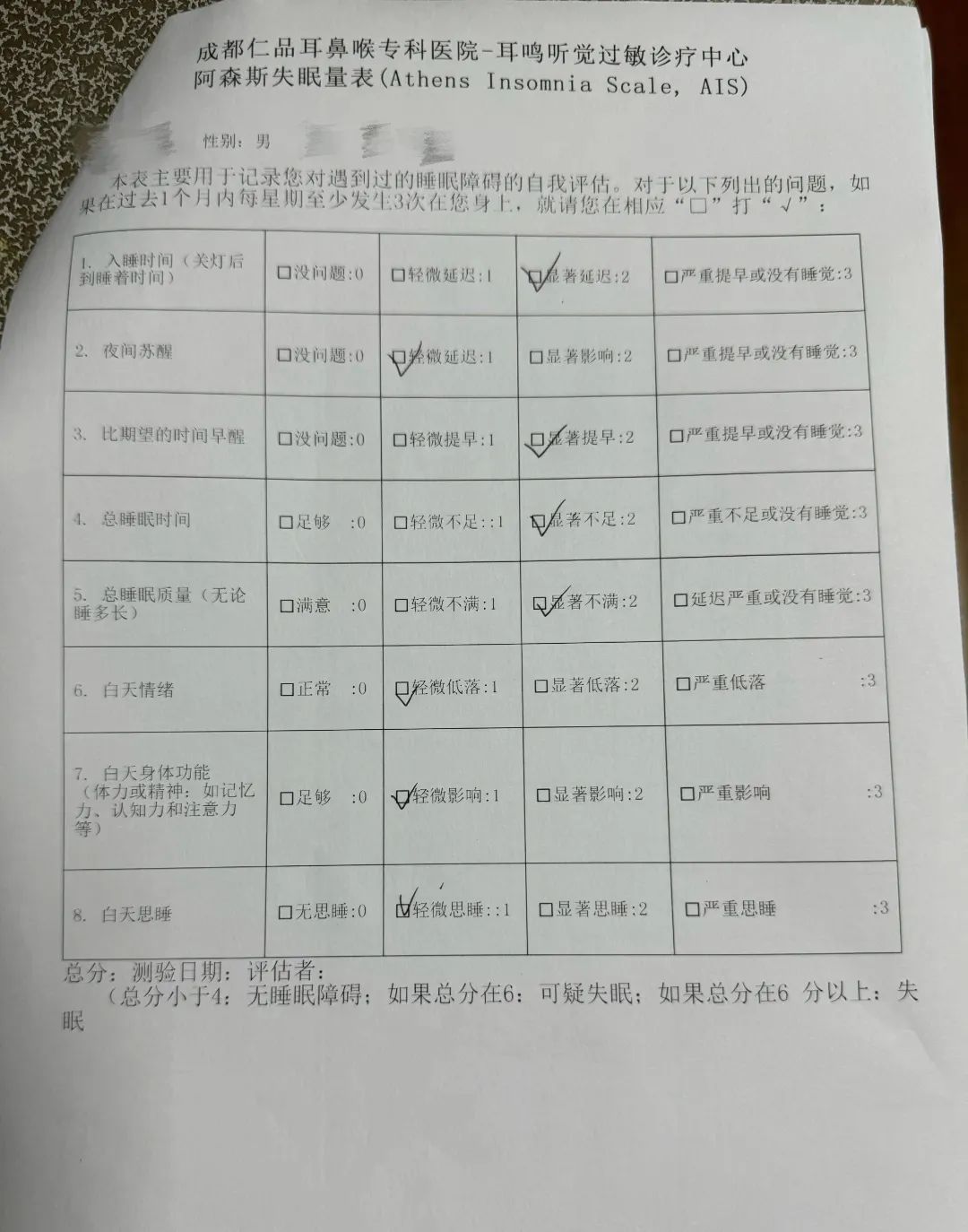 據醫生介紹,大部分因耳鳴導致失眠的患者,在阿森斯失眠量表中,對入睡時間(關燈后到睡著時間)、夜間蘇醒、比期望的時間早醒、總睡眠時間(無論睡多長)、總睡眠質量、白天情緒、白天身體功能(體力或精神……)、白天思睡等選項表示顯著或嚴重,當阿森斯失眠量表得分在6分或6分以上,耳鳴對其睡眠影響會比較大。